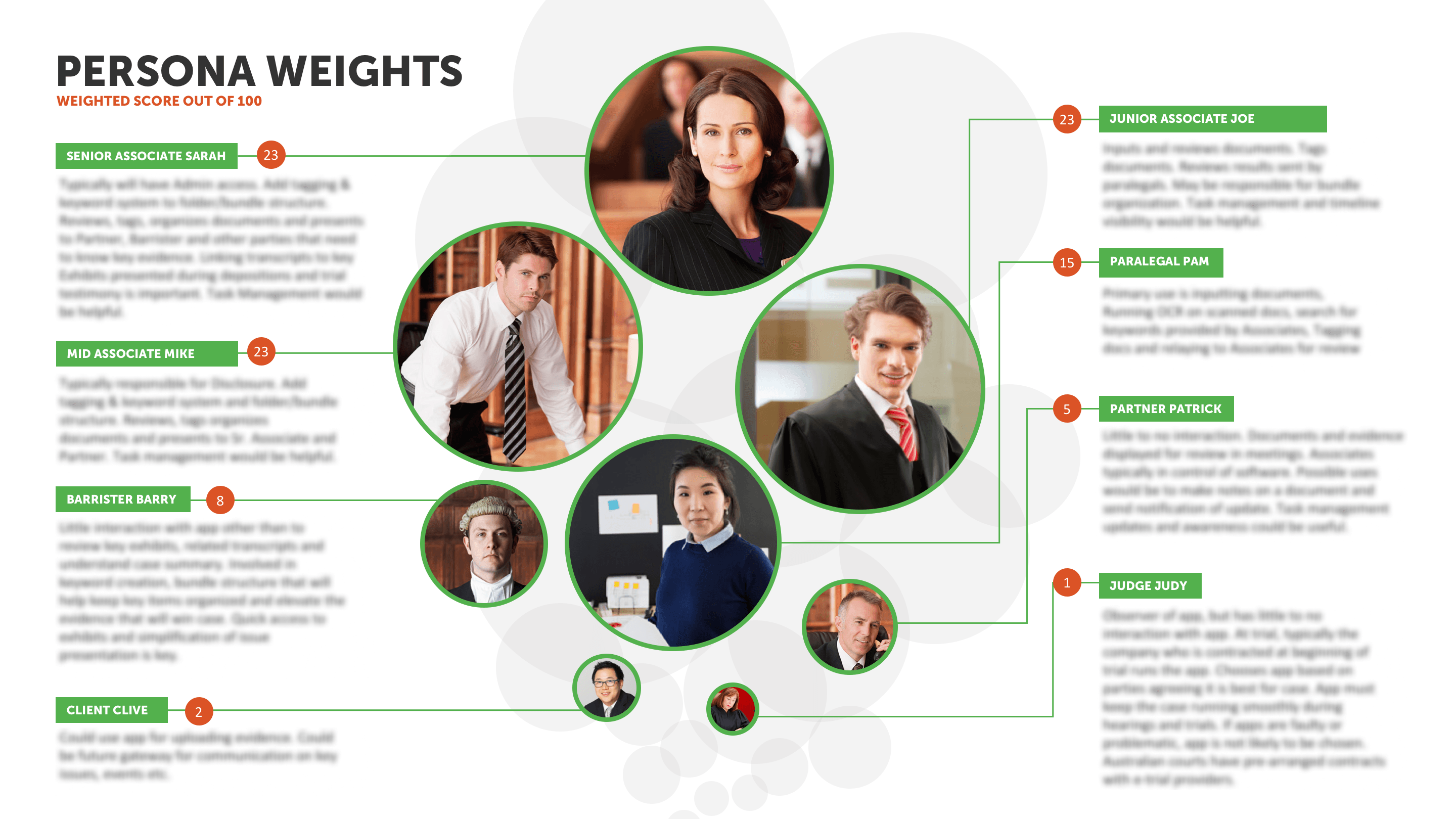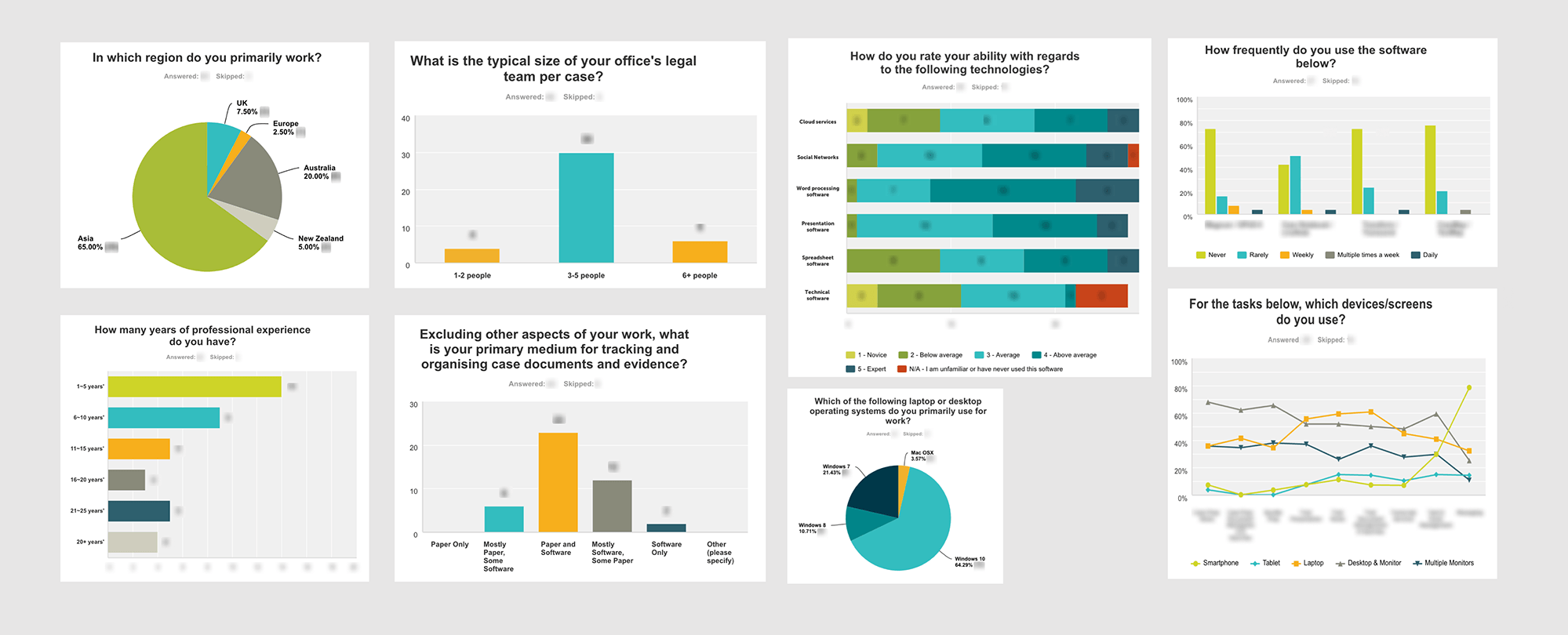 We used surveys to collect quantitative data from the US, UK, Australia, Europe and parts of Asia. If you're reading this and you're working on a project requiring User Research with lawyers, good luck with setting up an interview with them!