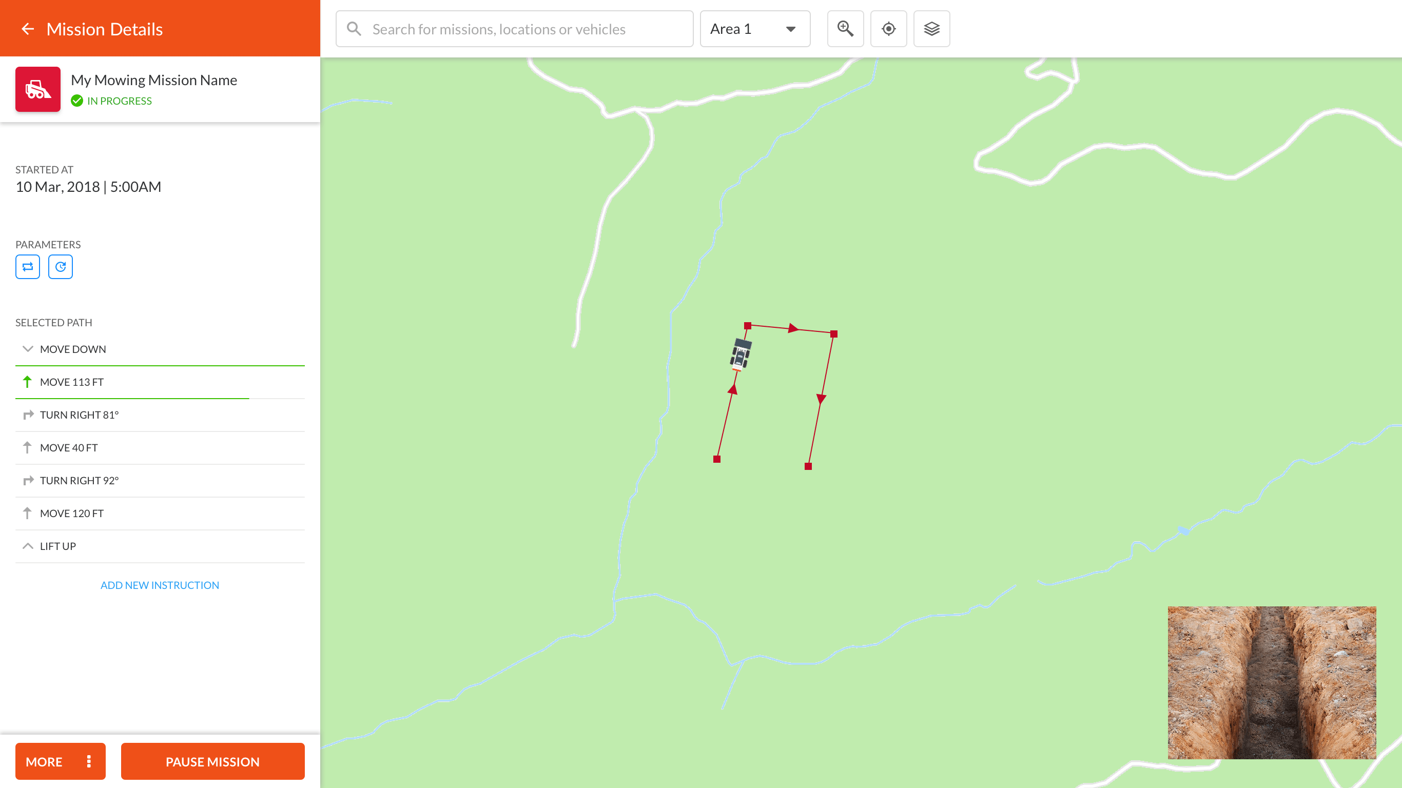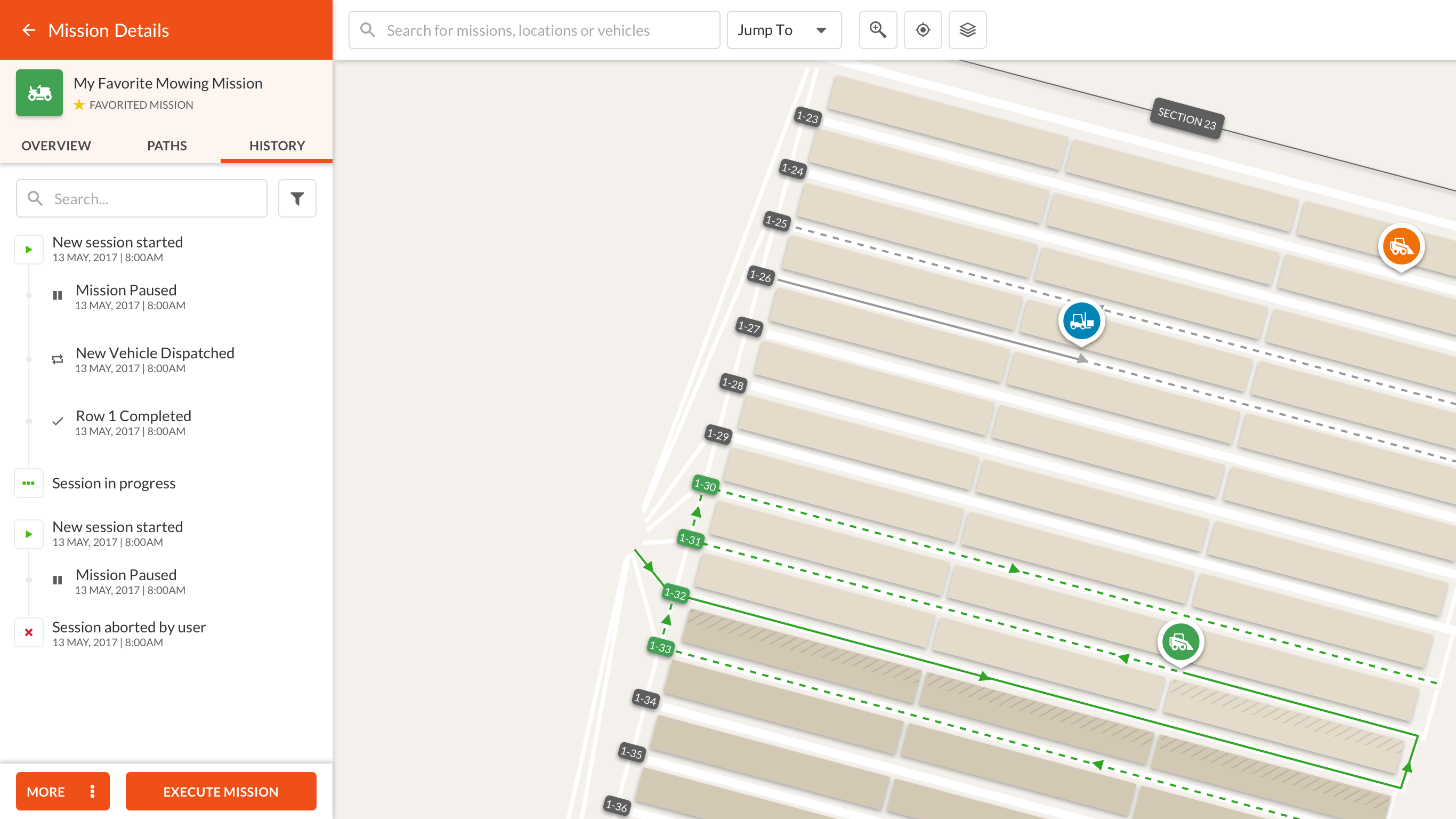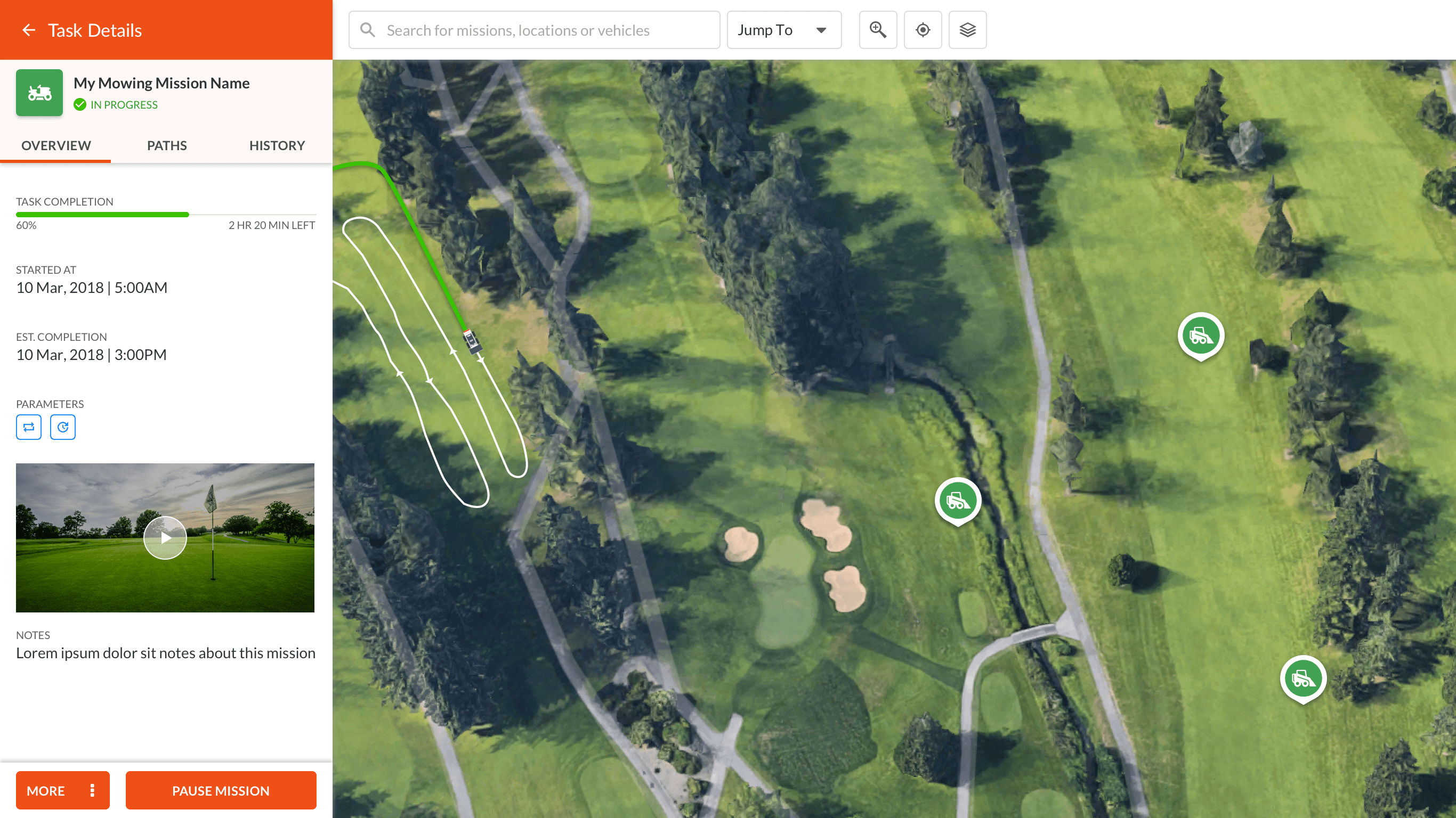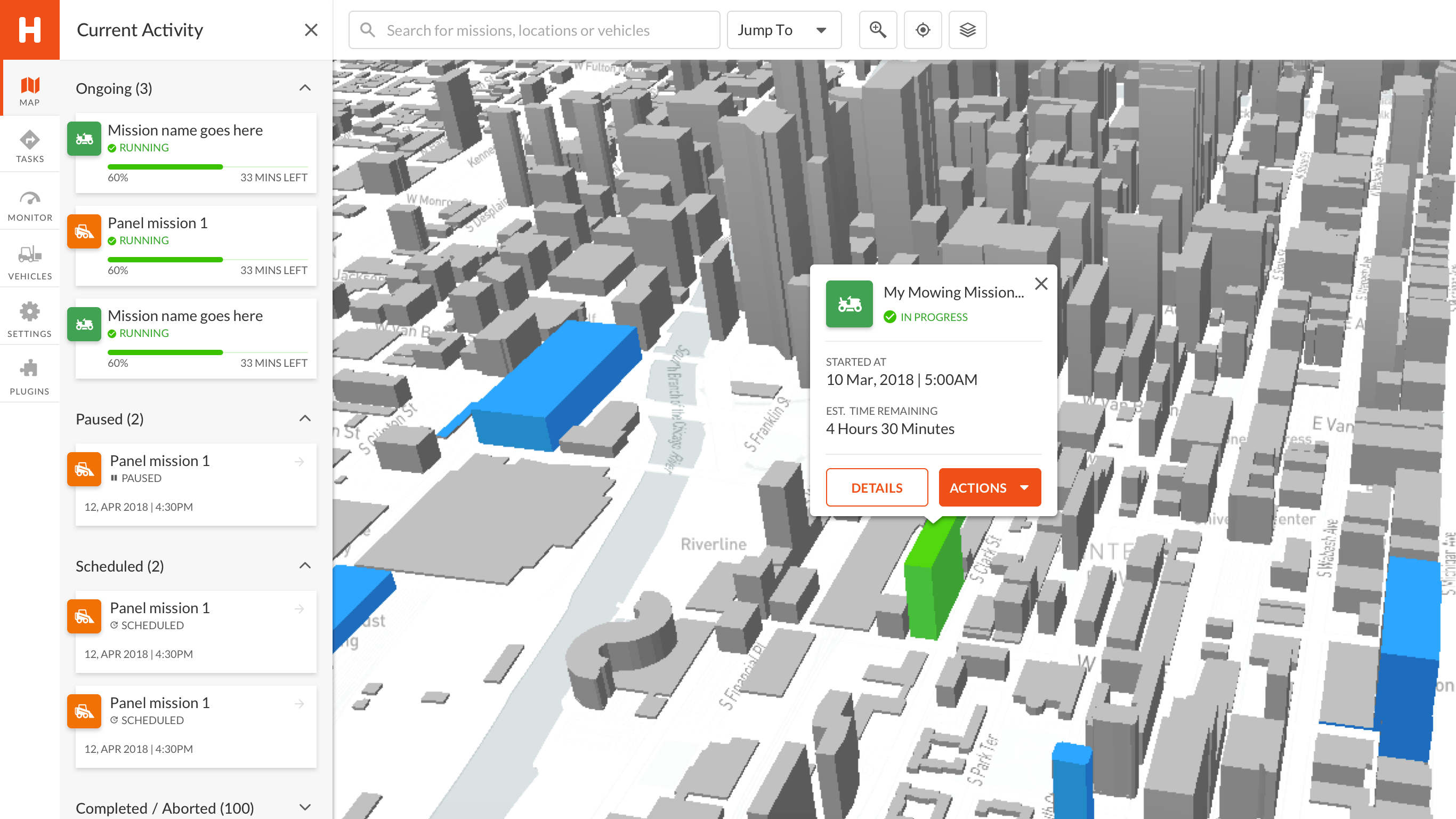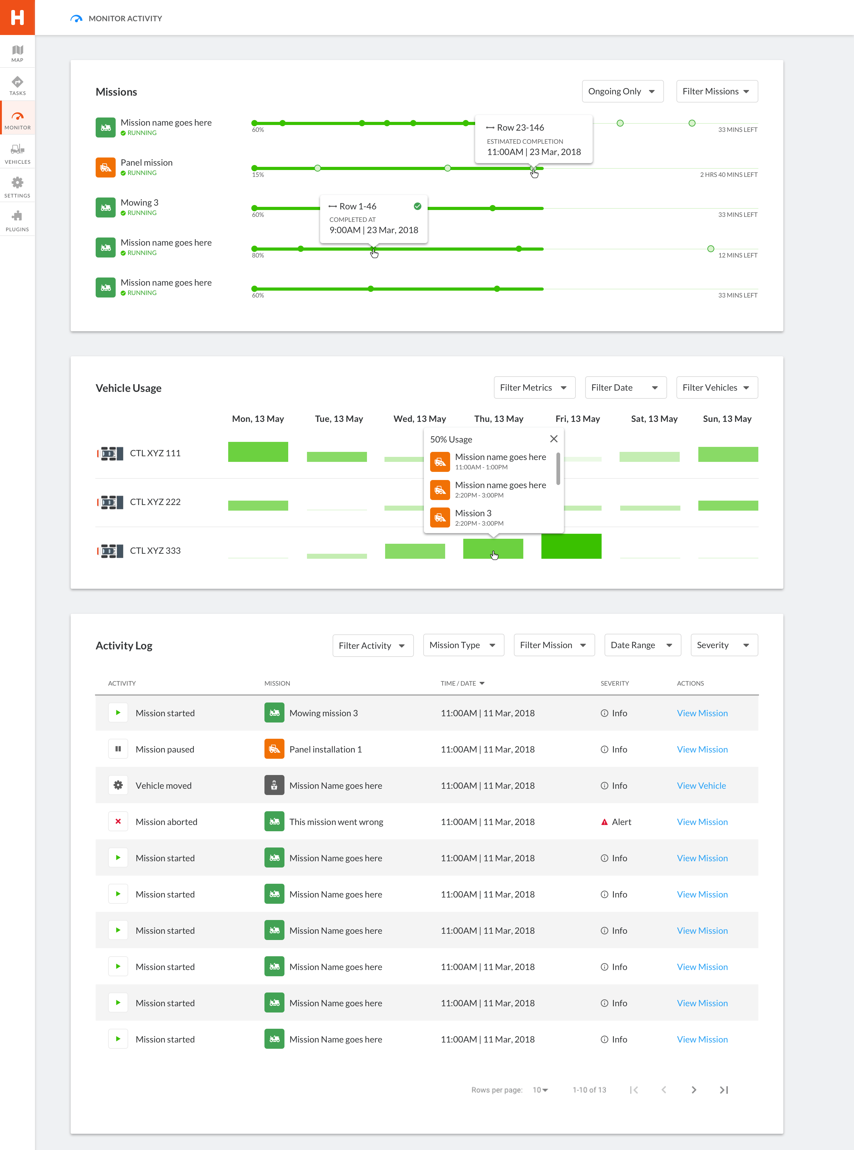 Monitor ongoing missions, including vehicle status, duration and history of activities.